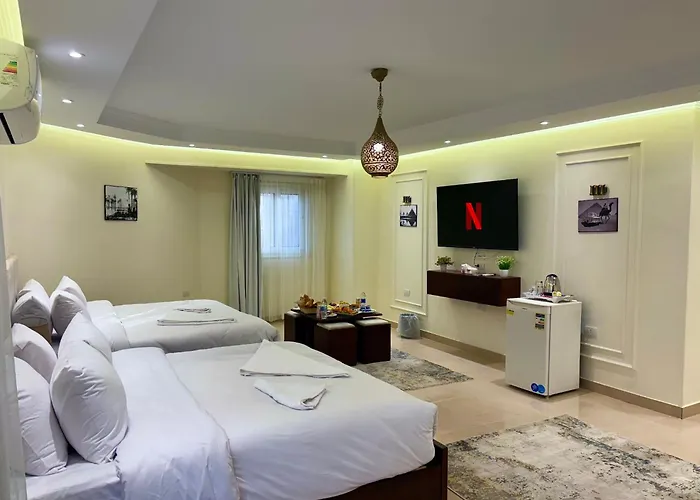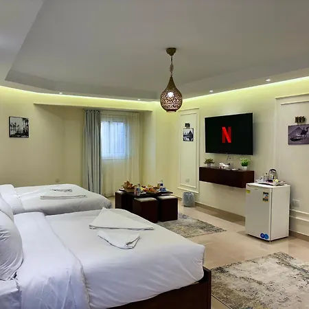 This aparthotel is also 3.4 km from Great Pyramid of Giza. The hotel is a 15-minute drive from the three Khafre's Pyramid. Giza to Cairo bus stop is within 800 metres of the Pyramids Boutique and within 9 km of is enough to get to El Giza train station.